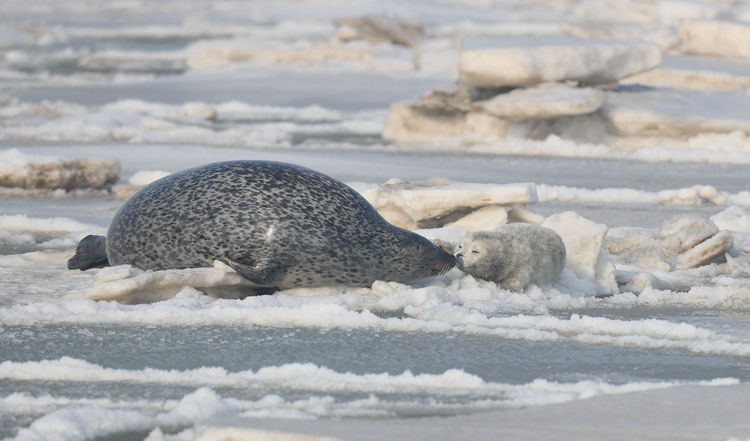 ▲幼年斑海豹(右)和母亲依偎在一起。